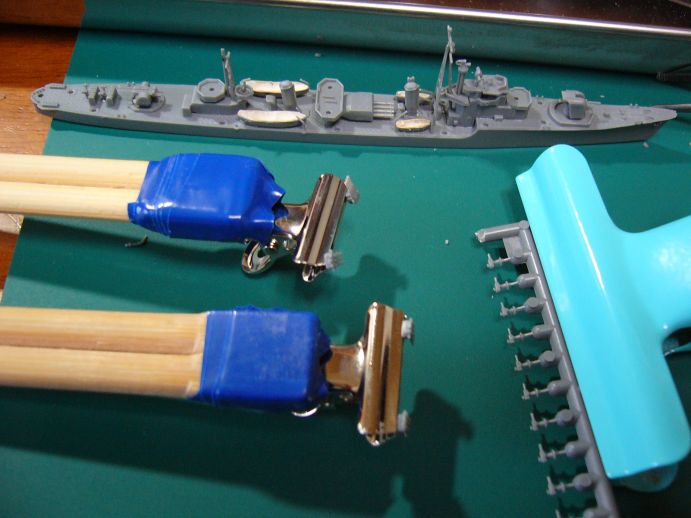 艦載ボートのマスキングと、割り箸にクリップを付けたモノにパーツを取り付ける。