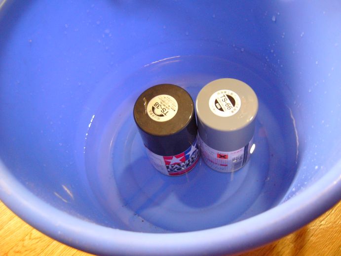 外に出て塗装するんだが、あいにくの雨なので、バケツに60度くらいのお湯を用意し、缶スプレーを温めておく。