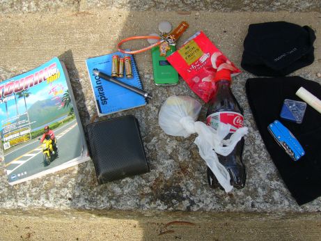 携帯電話、デジカメ、アイリバーMP3プレイヤー、ペツル・タクティカアダプト(ヘッドライト)、単3電池4本、単4電池8本、ケータイ充電器。