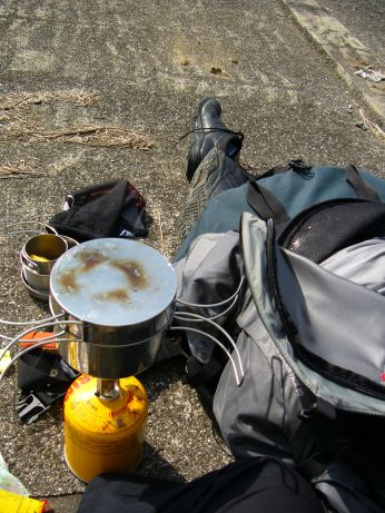 スポンジは水があるときにコッヘル洗いに使う、水が勿体無い状況ではトイレットペーパーで拭くだけ、こういう食事が汚くて耐えれない人に野宿旅はむいてない。