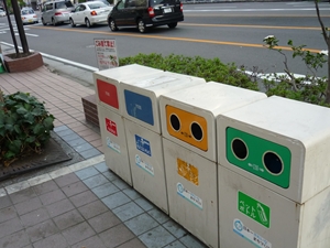 見えづらいがゴミ箱の奥の看板に、「市の中の美観地区だからゴミ捨てるな」と書いてある。