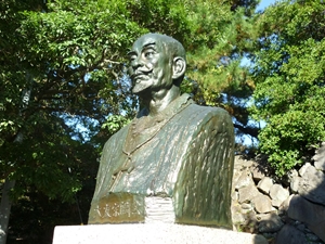 府内城の駐車場の車の陰に佇んでいた大友宗麟の像、しかしこの城とは関係ないらしい・・・。